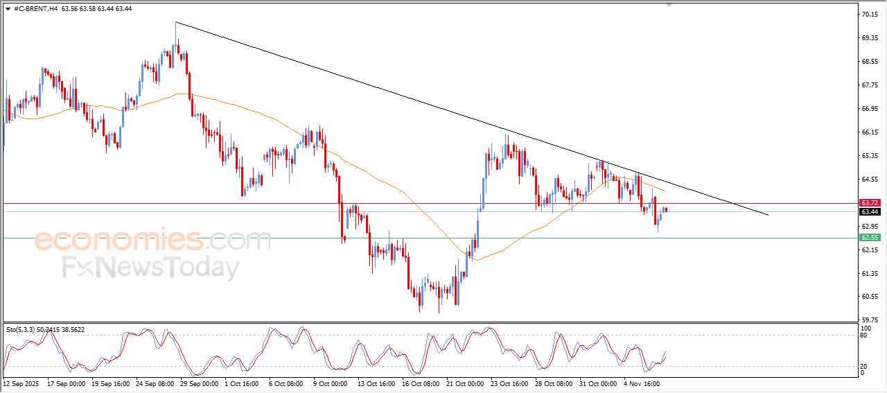 The (Brent) price declined in its last intraday trading, amid the continuation of the negative pressure that comes from its trading below EMA50, and under the dominance of the main bearish trend on the short-term basis and its trading alongside supportive trend line for this track, after offloading its oversold conditions on the relative strength indicators, which intensifies the negative pressure around the price.