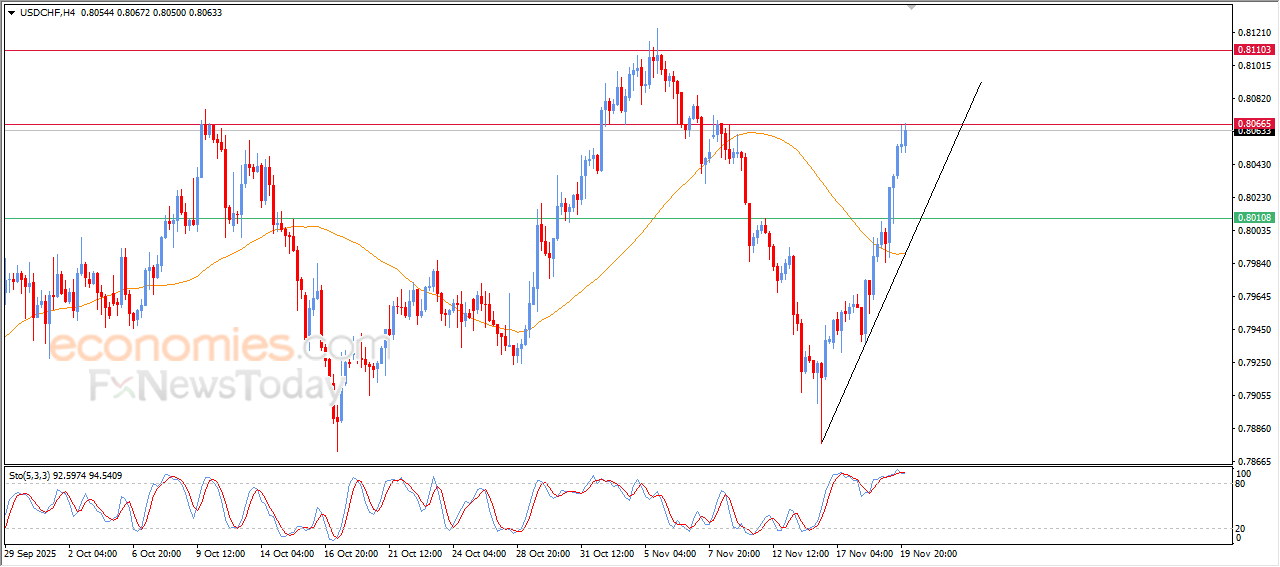 The (USDCHF) price kept rising in its last intraday trading, reaching 0.8065 resistance, amid the dominance of steep minor bullish wave, indicating the dominance of this track and its strength, amid the continuation of the dynamic support that is represented in its trading above EMA50, with the emergence of the relative strength indicators, despite reaching overbought levels.
