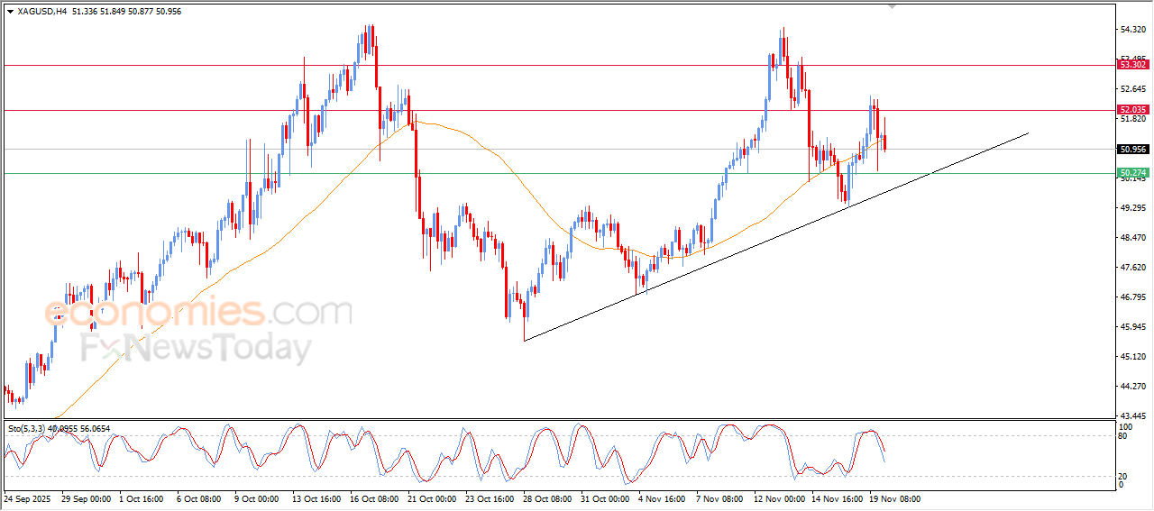 Silver price declined in its last intraday trading, due to the stability of the resistance at $52.00, this resistance was our expected target in our previous analysis, to attempt to gain bullish momentum that might help it breach this resistance, and attempts to offload some of its overbought conditions on the relative strength indicators, especially with the emergence of the negative signals, to surpass the support of its EMA50, which may reduce the chances of the price recover in the upcoming period, amid the dominance of the main bullish trend and its trading alongside minor trend line on the short-term basis.