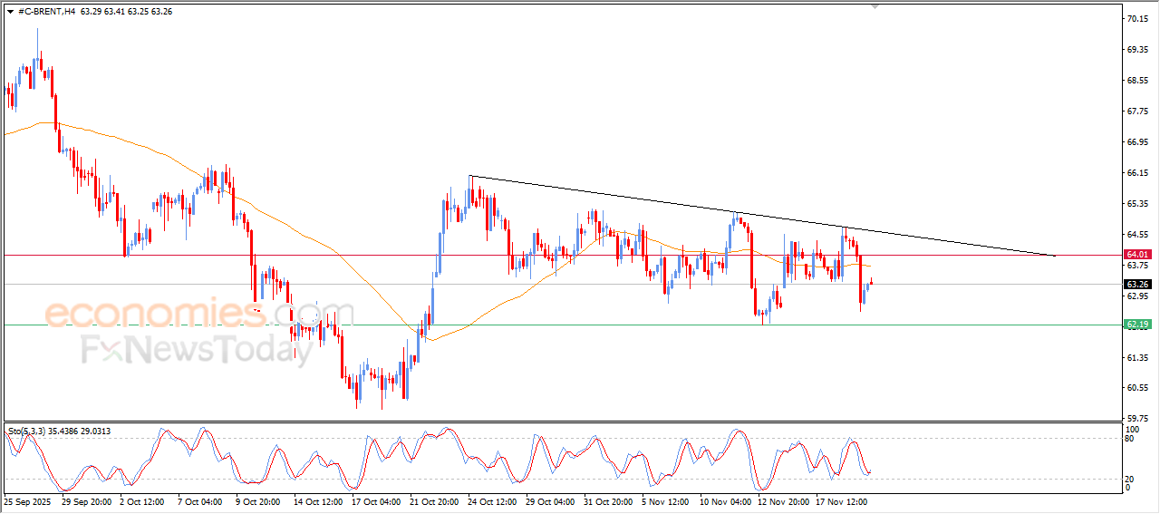 The (Brent) price settled with cautious rise in its last intraday trading, in an attempt to recover some of its previous losses, and attempting to offload some of the clear oversold conditions on the relative strength indicators, especially with the emergence of positive overlapping signals, amid the continuation of the negative pressure due to its trading below EMA50, with the dominance of the main bearish trend and its trading alongside minor trend line on the short-term basis.