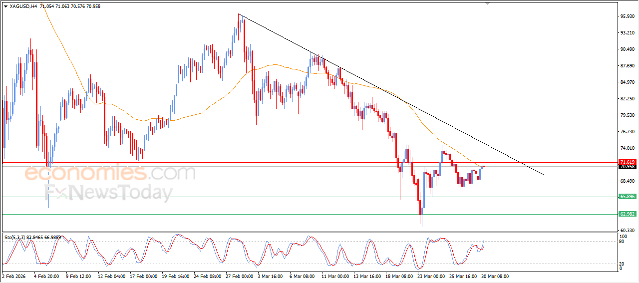 Silver is stabilizing on recent intraday gains, approaching the resistance of EMA50. This comes amid the dominance of a short-term downtrend, with price movements alongside a trendline supporting this bearish path, which reduces the chances of a sustained recovery in the near term, the relative strength indicators reached overbought levels, while the price remains below the key resistance level at $71.60, reinforcing negative pressure.