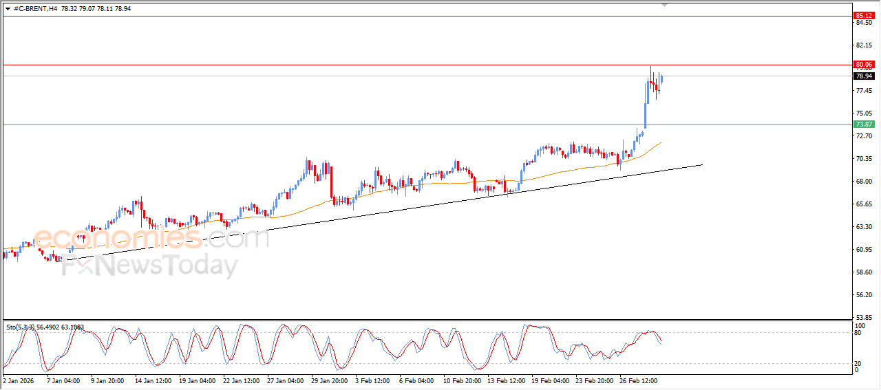 The (Brent) price rose in its last intraday trading, after gathering the gains of its previous rises, and offloading its overbought conditions on relative strength indicators, gaining bullish momentum that helped it to achieve these gains, preparing to attack the main resistance at $80.00, which was an expected target in our previous analysis, with the continuation of the dynamic support that is represented by its trading above EMA50, with the dominance of the main bullish trend on short-term basis.