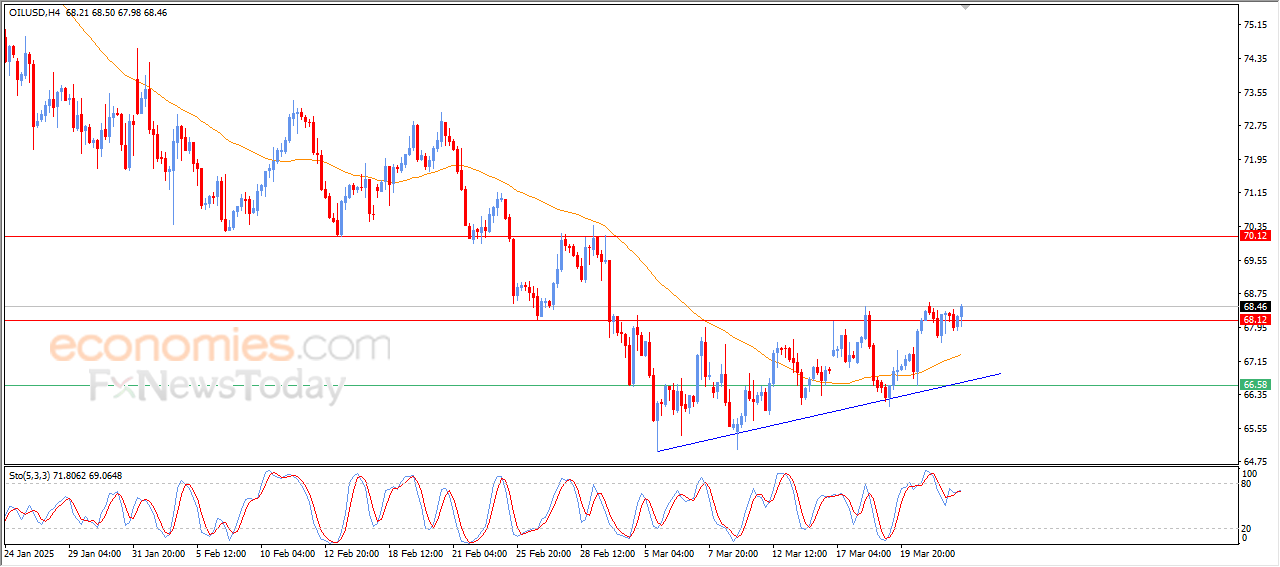 US crude oil prices expanded the gains in latest intraday trading and confirmed the breach of the pivotal resistance of $68.00, amid the dominance of the upward correctional trend in the short term as the price trades alongside the trend line, with ongoing support due to trading above the 50-candle SMA.