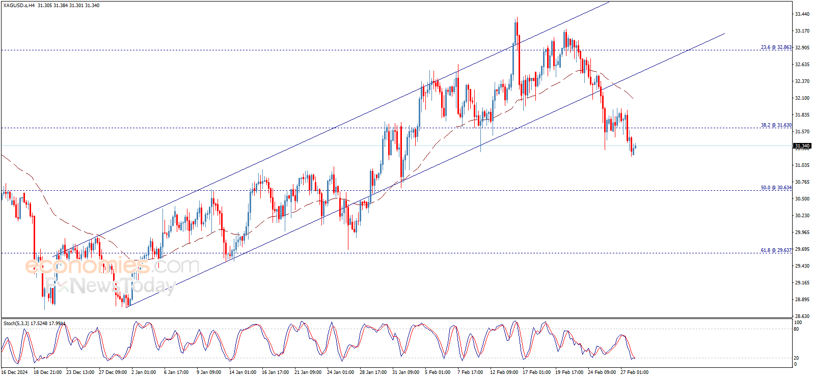 Silver price confirmed breaking 31.63$ after closing the daily candlestick below it, to fall under expected negative pressure in the upcoming sessions, supported by the EMA50 that forms additional negative pressure against the price.
