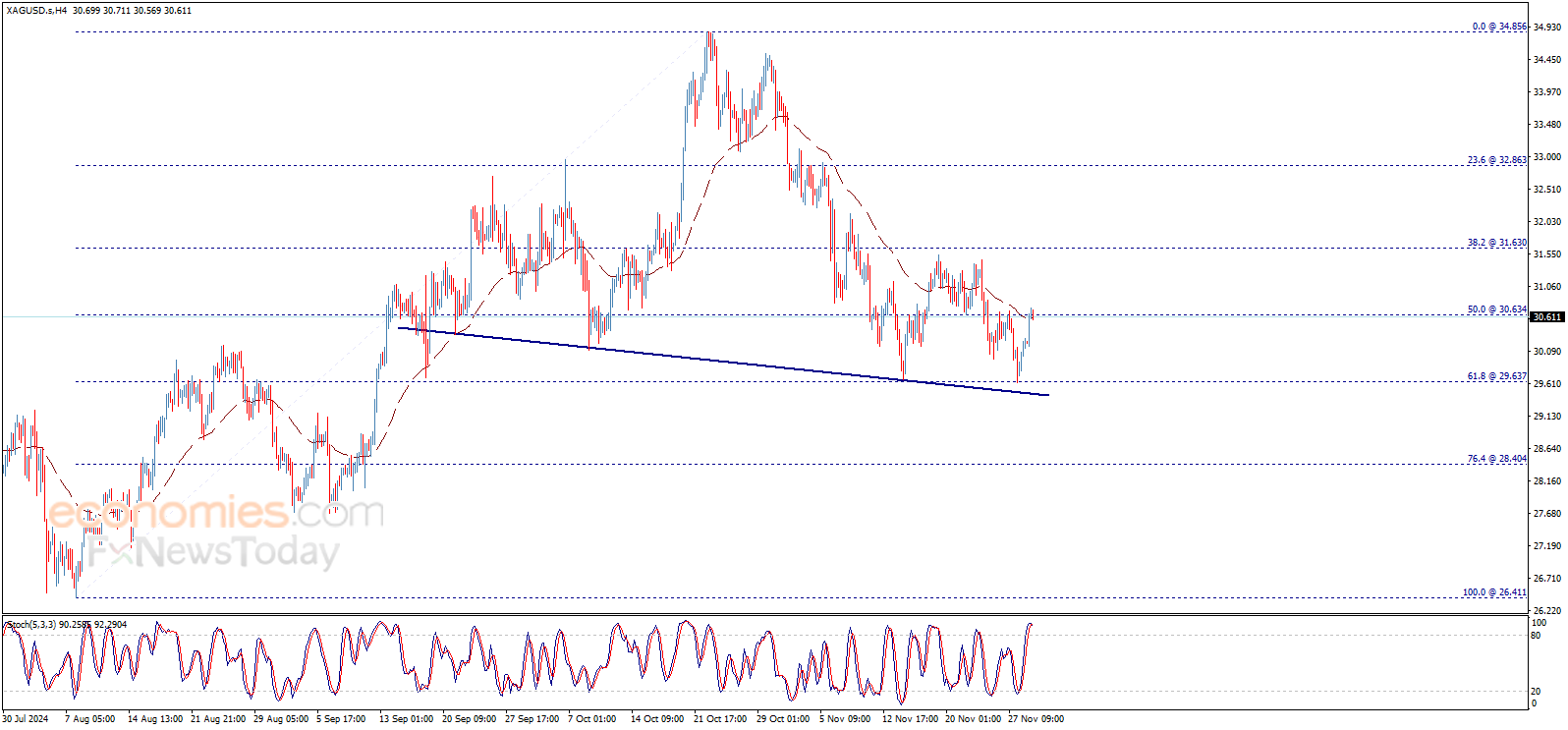 Silver price fluctuates around 30.63$ level since morning, waiting to get positive motive that assist to push the price to confirm breaching this level followed by heading towards 31.63$ as a next positive target, to continue suggesting the bullish trend unless breaking 30.40$ and holding below it.