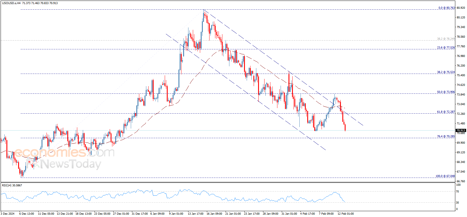 Crude oil price confirmed breaking 72.30$ level after closing yesterday below it, starting today with strong decline to head towards expected testing to 70.30$ level, noting that the price returns to the bearish channel that appears on the chart.
