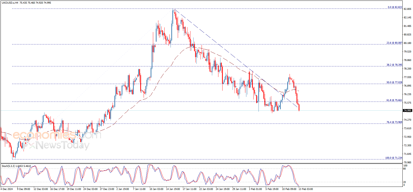 Brent oil price broke 75.66$ level clearly and closed the daily candlestick below it, to confirm turning to decline and head to achieve more bearish bias, as it begins today with additional negativity to surpass 75.00$ barrier and attempt to hold below it.