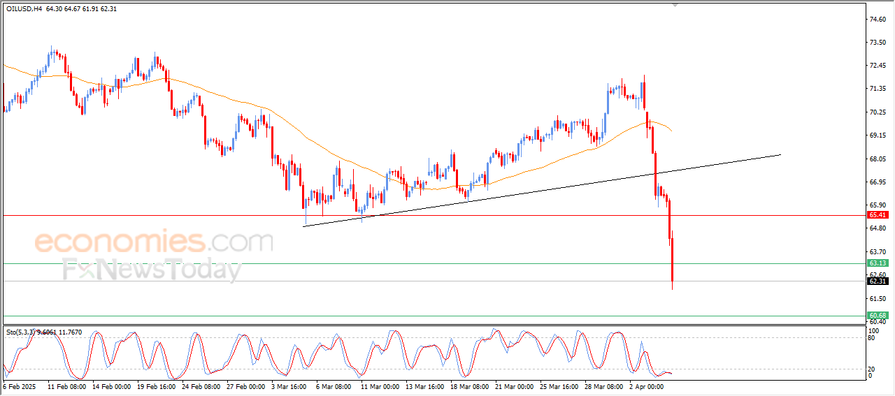 US crude oil price extended its losses in a free fall in the intraday levels, amid the dominance of the main downward trend, with the price breaching the current support of $63.10, as negative signals emerged from the Stochastic despite settling at oversold levels, indicating the strength of the selling momentum.