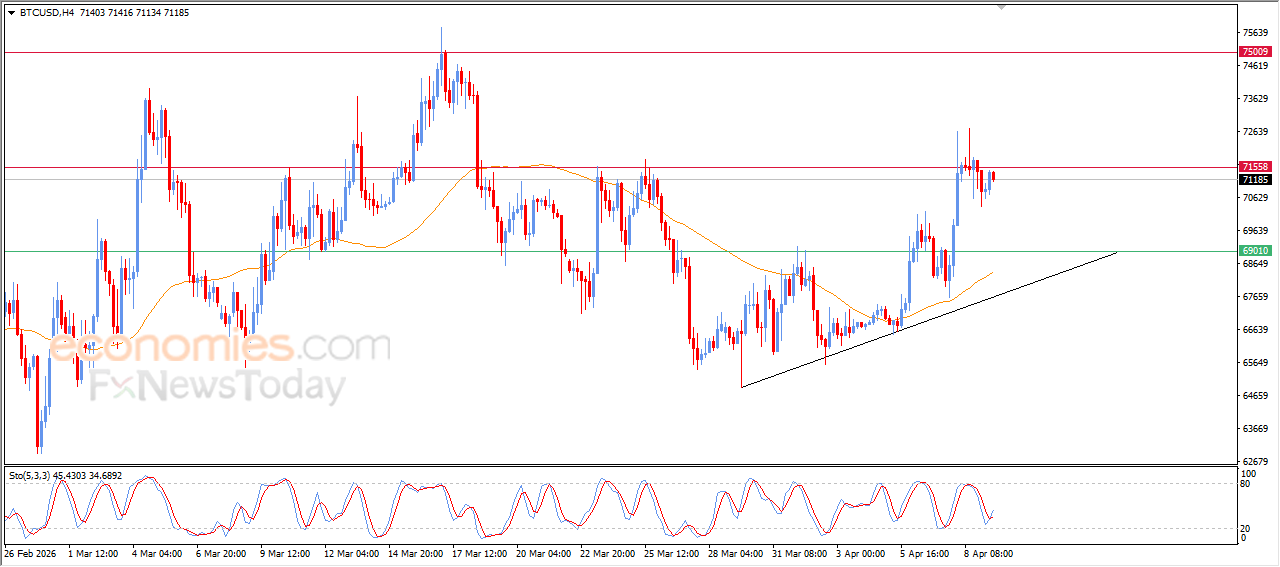 Bitcoin (BTCUSD) is holding onto gains during recent intraday trading, as it attempts to break through the strong resistance level at $71,500. This is supported by continued trading above EMA50, along with the dominance of a short-term minor bullish wave and movement alongside a trendline that enhances its stability.