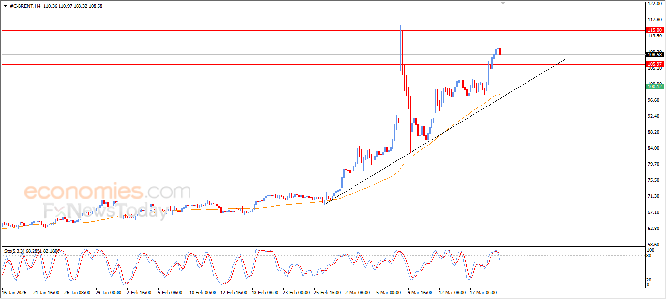 Brent prices declined in their last intraday trading, to gather the gains of its previous rises, attempting to gain bullish momentum that might help it to recover and rise again, attempting to offload some of its clear overbought conditions on the relative strength indicators, especially with the emergence of the negative signals from them, amid the dominance of the main bullish trend on short-term, with its movement alongside supportive minor trend line for this path.