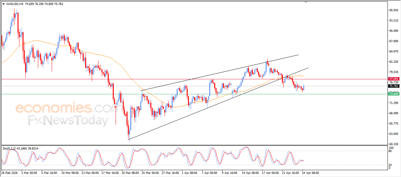 Silver rose in recent intraday trading, attempting to recover some of its previous losses, and it attempts to offload its oversold conditions on the relative strength indicator, especially with the emergence of positive signals from them, affected by negative technical formation on the short-term basis, which is represented by the rising wedge pattern, with the continuation of the negative pressure due to its trading below EMA50, intensifying the negative pressure on the price.