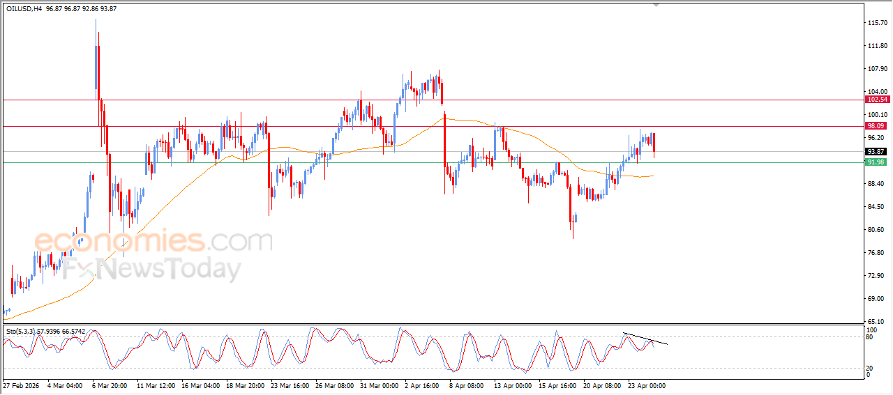Brent crude oil declined in its recent intraday trading, with the emergence of negative signals from the relative strength indicators, after reaching overbought levels, attempting to gain bullish momentum that might help it to recover and rise again, amid the dominance of steep minor bullish wave that indicates the strength of this trend, with the continuation of the dynamic pressure that is represented by its trading above EMA50, reinforcing the chances of the price return to rise.