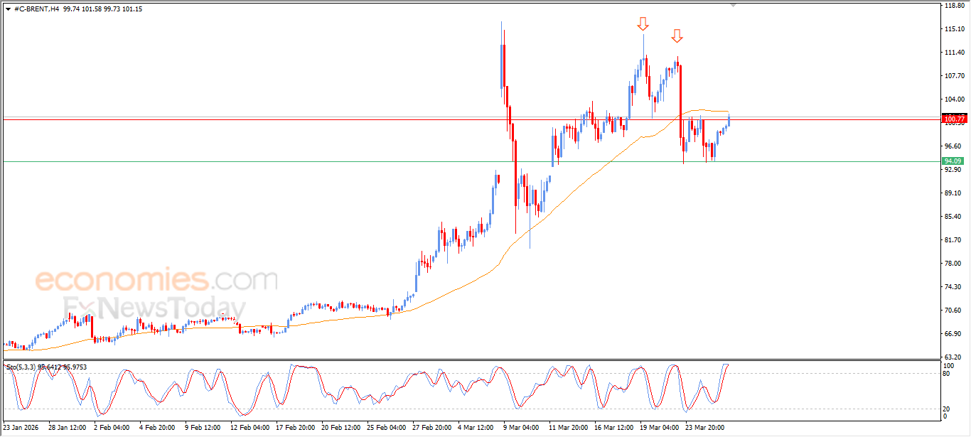 Brent crude oil (Brent) moved higher in its recent intraday trading, retesting the key resistance level at $100.80. This level represents the neckline of a previously formed bearish pattern (double top) on the short-term timeframe.