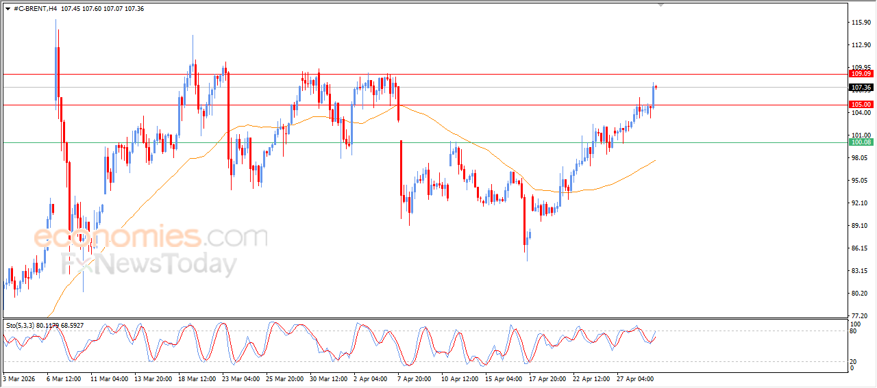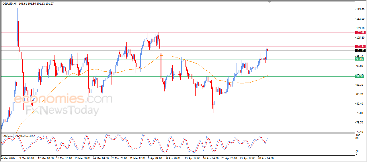 Brent witnessed sharp gains during recent intraday trading, breaching $105.00 resistance, opening the way for targeting new resistance levels, after offloading its overbought conditions on the relative strength indicators, opening the way for achieving these gains, amid the continuation of the dynamic pressure that is represented by its trading above EMA50, reinforcing the stability of the bullish trend on short-term basis.