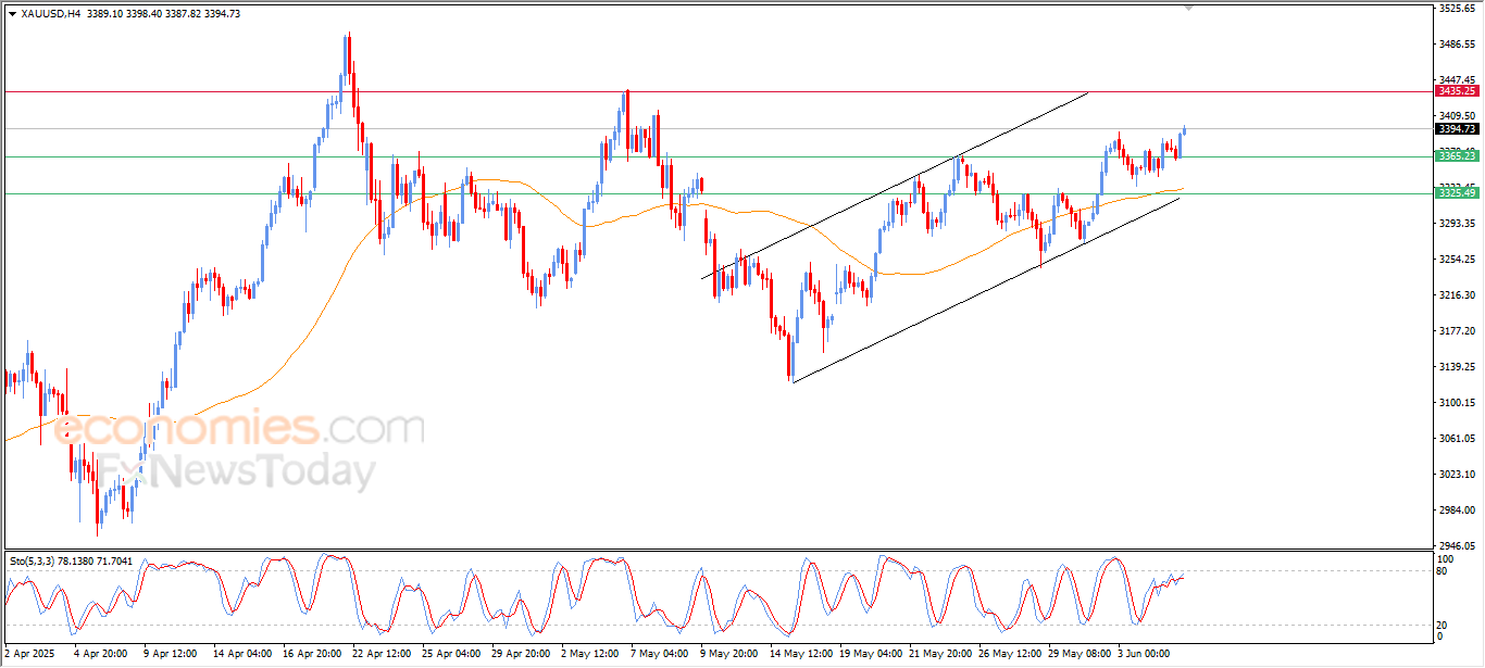 The price of (Gold) rose in its last intraday trading, settled above the support at $3,365, supported by the emergence of the positive signals on the (RSI),providing positive momentum especially amid its trading within a minor bullish channel’s range that limits its previous trading on the short-term basis, with the continuation of the dynamic support that is represented by its trading above its EMA50.