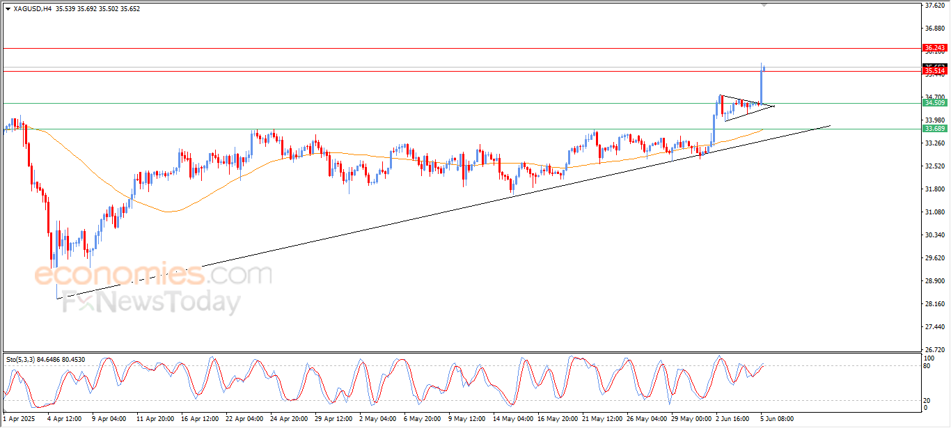 The price of (Silver) soars high in its last intraday trading, breaching the critical resistance level at $34.50, providing positive momentum to confirm forming a positive technical pattern, which is the flag pattern, providing a push to the upside to reach our target at $35.50, surpassing it currently amid the dominance of the main bullish trend on the short-term basis and its trading alongside a bias line, with the emergence of the positive signals on the (RSI), despite reaching exaggerated overbought levels.
