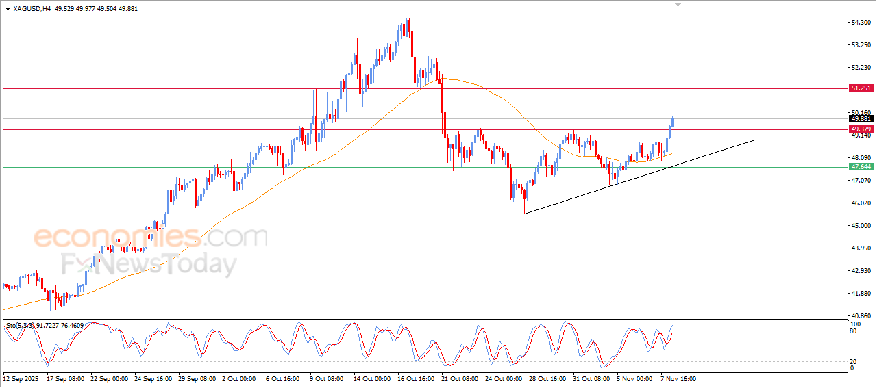 The price of (silver) kept rising in its last trading on the intraday levels, to breach the key resistance at $49.40, supported by its continuous trading above EMA50, and under the dominance of the main bullish trend and its trading alongside minor trendline on the short-term basis, besides the emergence of the positive signals on the relative strength indicators, despite reaching overbought levels.