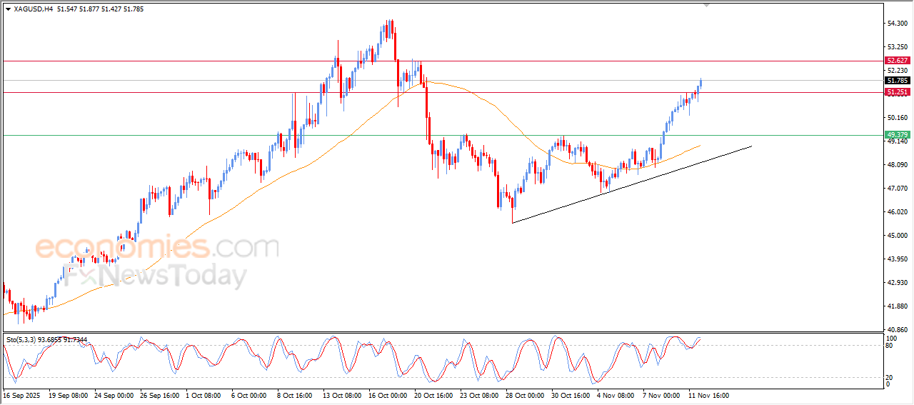The price of (silver) extended its gains in its last intraday trading, to breach the current resistance level at $51.25, taking advantage of the positive support that comes from its trading above EMA50, amid its trading alongside minor bullish trend line on the short-term basis, besides the emergence of the positive signals on the relative strength indicators, despite reaching overbought levels.