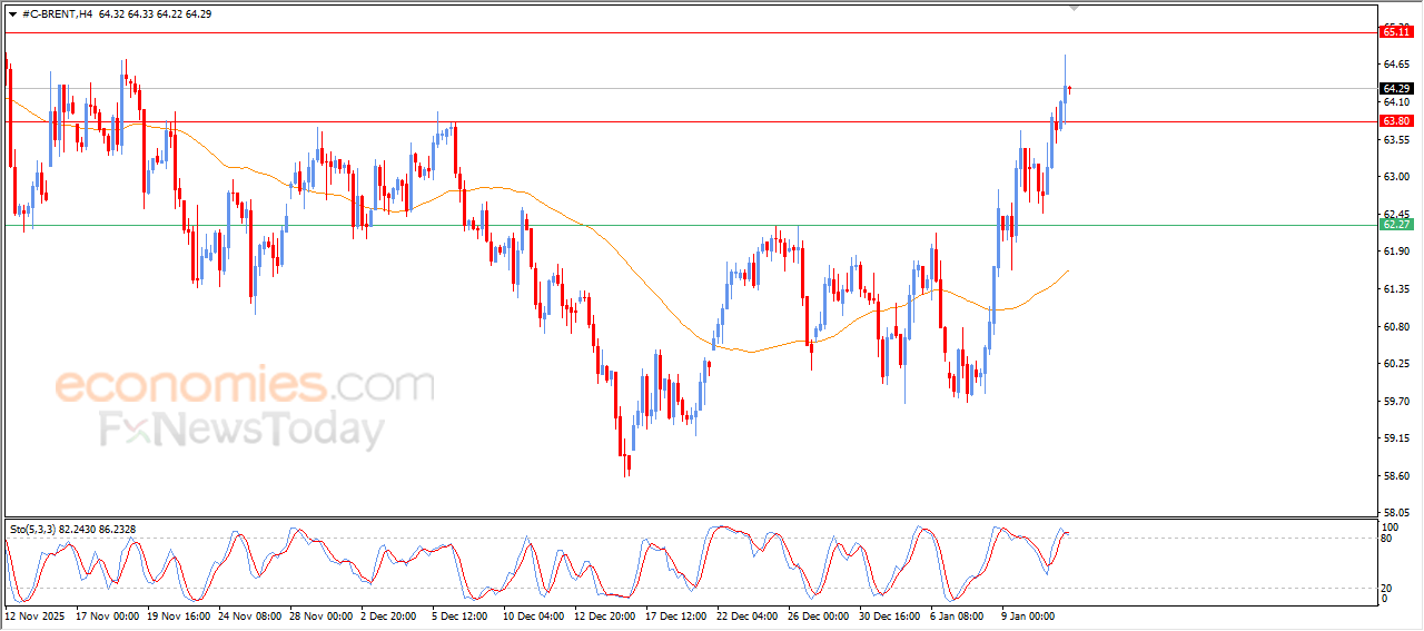 Brent crude oil’s prices kept rising in its last intraday trading, to breach $63.80 resistance, which was an expected target in our previous analysis, supported by its continuous trading above EMA50, reinforcing the stability and strength of the bullish track on the short-term basis, on the other hand, we notice the emergence of negative overlapping signals from the relative strength indicators, after reaching overbought levels, which might reduce the upcoming gains.