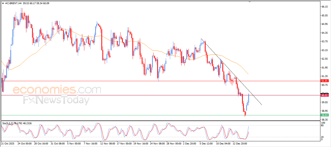 Brent crude oil’s price extended its gains in its recent intraday trading, attempting to correct the main bearish trend on the short-term basis, amid its trading alongside steep minor bearish trend line, to retest $60.00 resistance, supported by the emergence of the positive signals on the relative strength indicators, reaching exaggerated overbought levels compared to the price move, to indicate a quick decline for the bullish momentum.