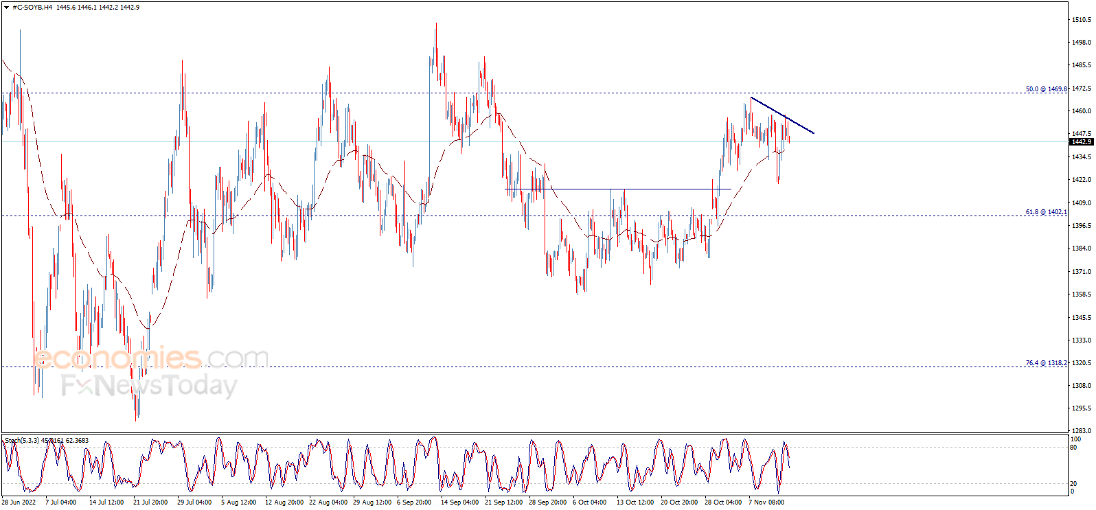 Soybean price reached the thresholds of the second waited target at 1415.00 and returned to fluctuate around 1450.00, noticing that the price begins today with new decline, affected by stochastic negativity, to keep the bearish trend scenario active, noting that our next negative station reaches 1402.10.