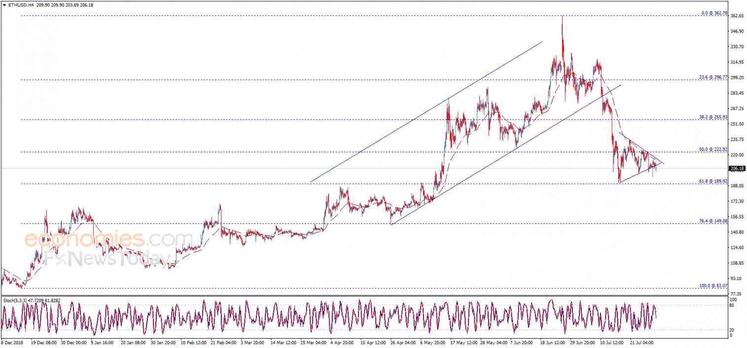 Ethereum price completed forming symmetrical triangle pattern after breaking it this morning, to get negative motive that supports the expectations of continuing the bearish trend, reinforced by stochastic negativity that appears on the four hours’ time frame, waiting to test 189.90 level initially.