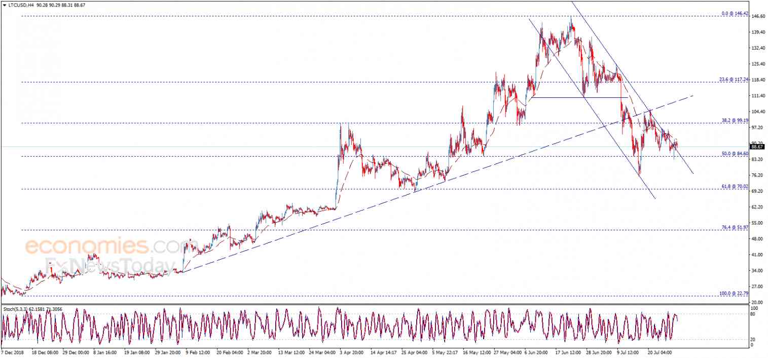 Litecoin price settles below the EMA50, which continues to press negatively on the price, noticing that stochastic provides negative overlapping signal that we are waiting to motivate the price to decline in the upcoming sessions, as our next targets begin at 84.60 and extend to 70.00 after breaking the previous level.