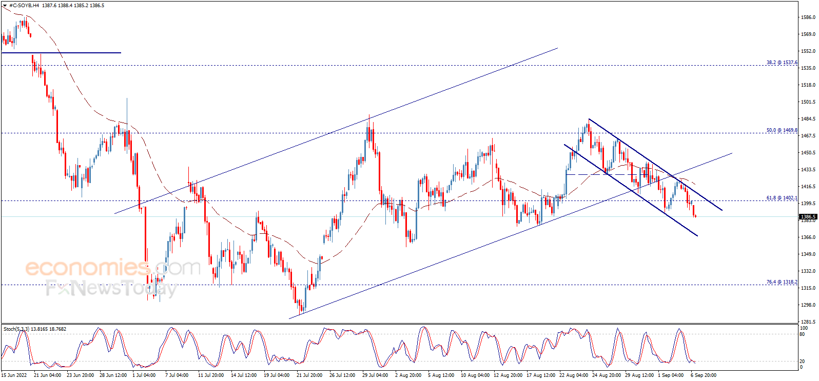 Soybean price resumed its negative trading clearly to surpass our first target at 1402.10 and approaches the second target at 1378.00, reinforcing the expectations of continuing the bearish trend, which its negative targets extend to reach 1360.00 followed by 1318.20.