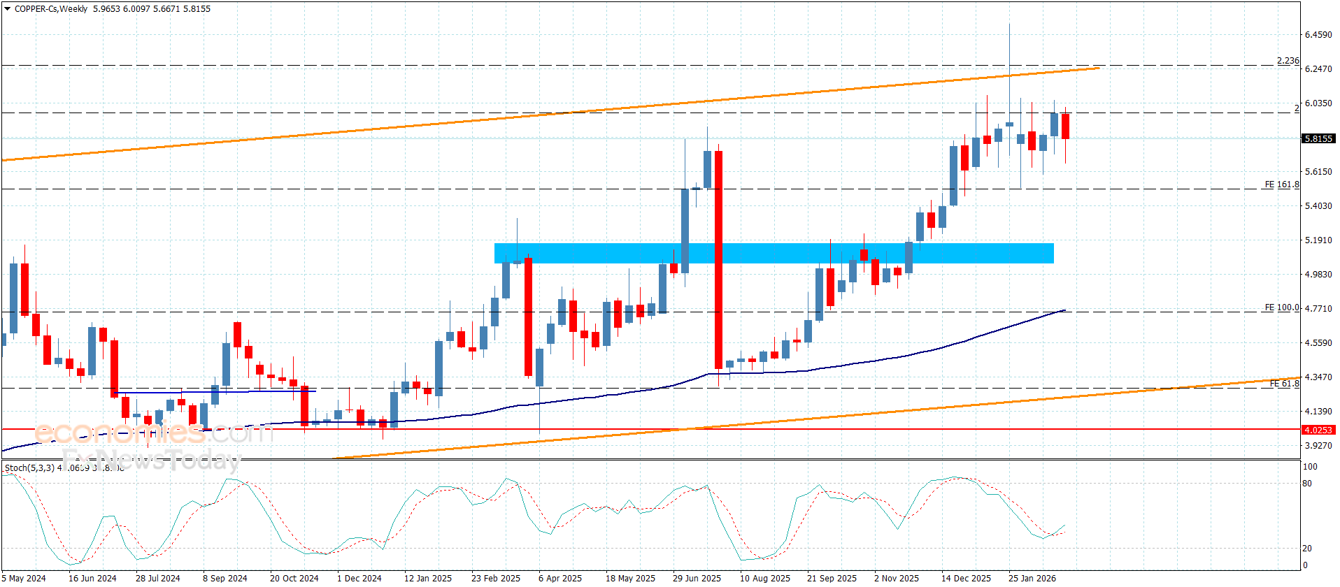 No change on copper price’s bearish corrective track until this moment due to the negative stability below $5.9700 level, increasing the chances of forming bearish waves, attempting to reach the negative stations at $5.6200 and $5.5100.