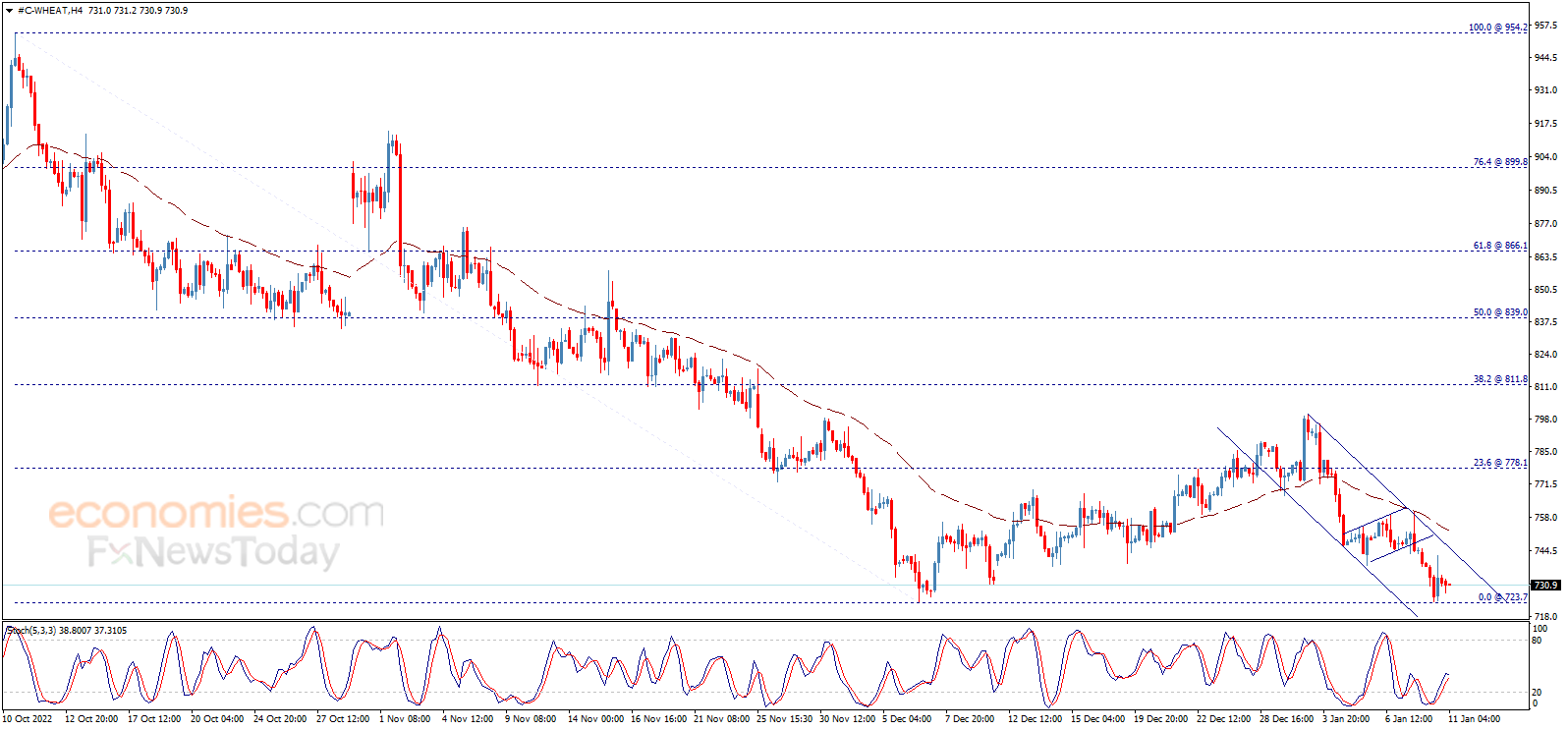 Wheat price succeeded to achieve our main waited target at 723.70 and settles near it, moving within bearish channel that supports the chances of surpassing the mentioned level to head towards achieving additional negative targets that reach 704.50.
