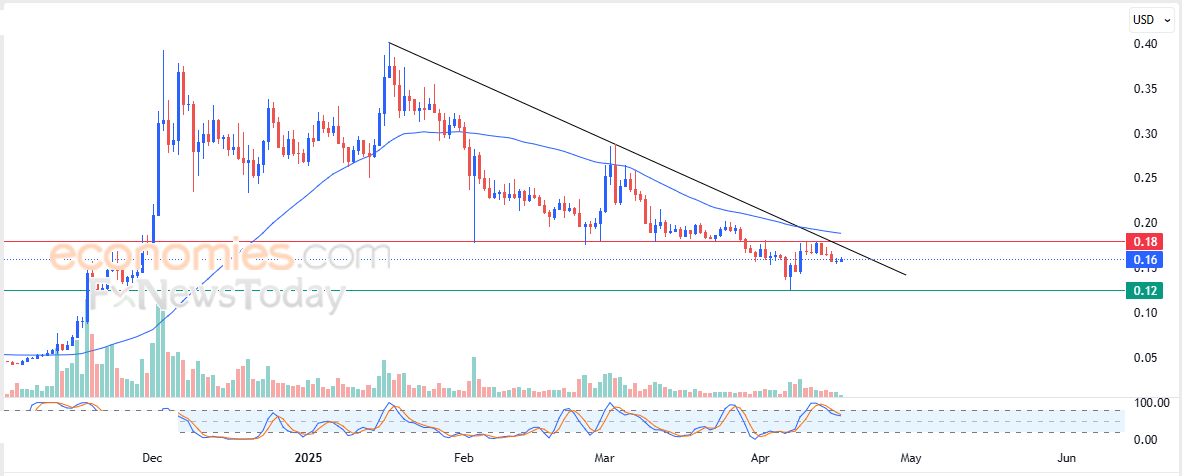 Therefore we expect the price to decline in upcoming trading, provided it settles firmly below $0.18, targeting the support of $0.12.