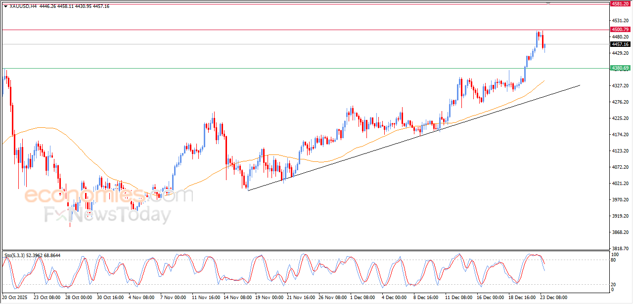 (Gold) settled on a decline in its last intraday trading, attempting to gather the gains of its previous rises, and attempts to offload its overbought conditions on the relative strength indicators, gathering its bullish momentum that might help it to recover and rise again, amid the dominance of the main bullish trend on the short-term basis and its trading alongside supportive trend line for this track.