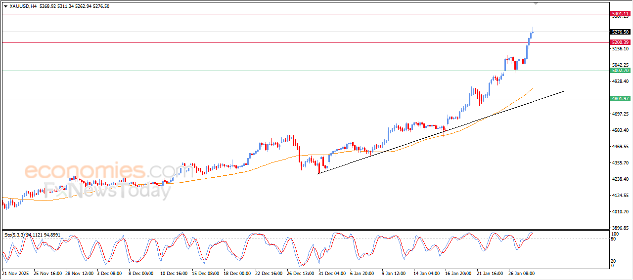 The price of gold kept rising in its last intraday trading, achieving new all-time highs, affected by breaching $5,200 resistance, amid the dominance of the main bullish trend on short-term basis, with its trading alongside minor bullish trend line, besides the emergence of positive signals from relative strength indicators, despite reaching overbought levels, which might reduce the upside track temporarily in the upcoming period.
