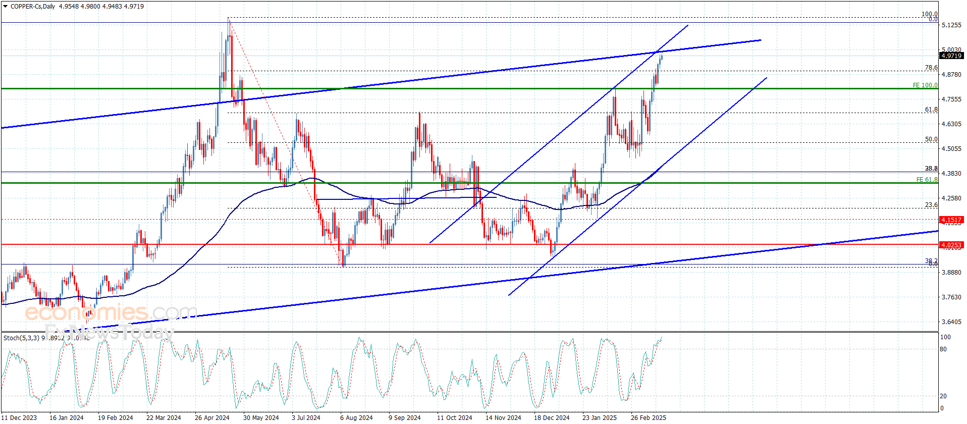 Copper prices kept advancing and approaching the psychological barrier of $5000, which represents an extension to the ascending secondary channel as shown in the attached chart.