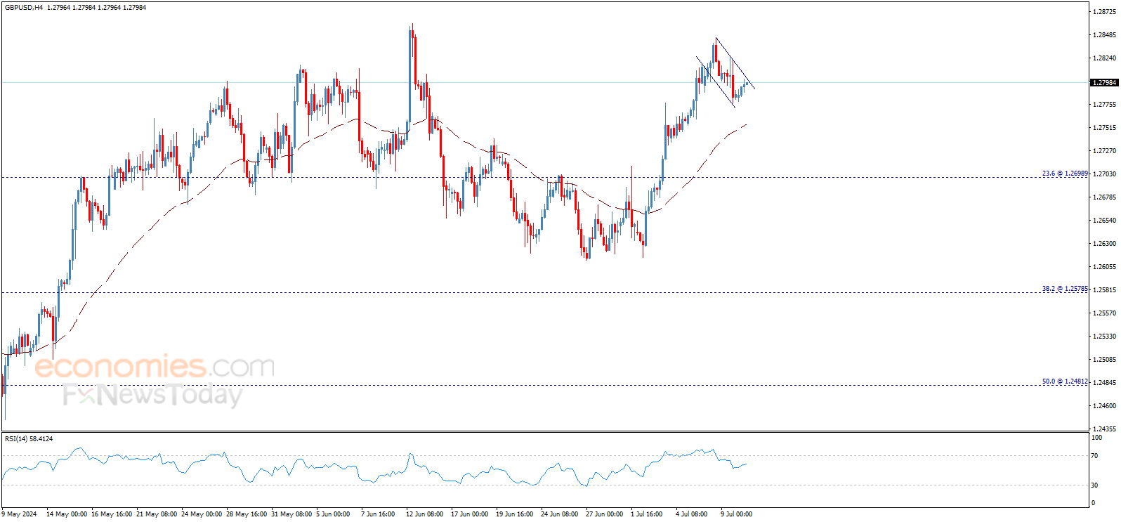 The GBPUSD price shows positive trades now to attempt to breach the bullish flag pattern’s resistance line that appears on the chart, waiting to motivate the price to continue the rise and achieve our main expected target at 1.2890$.
