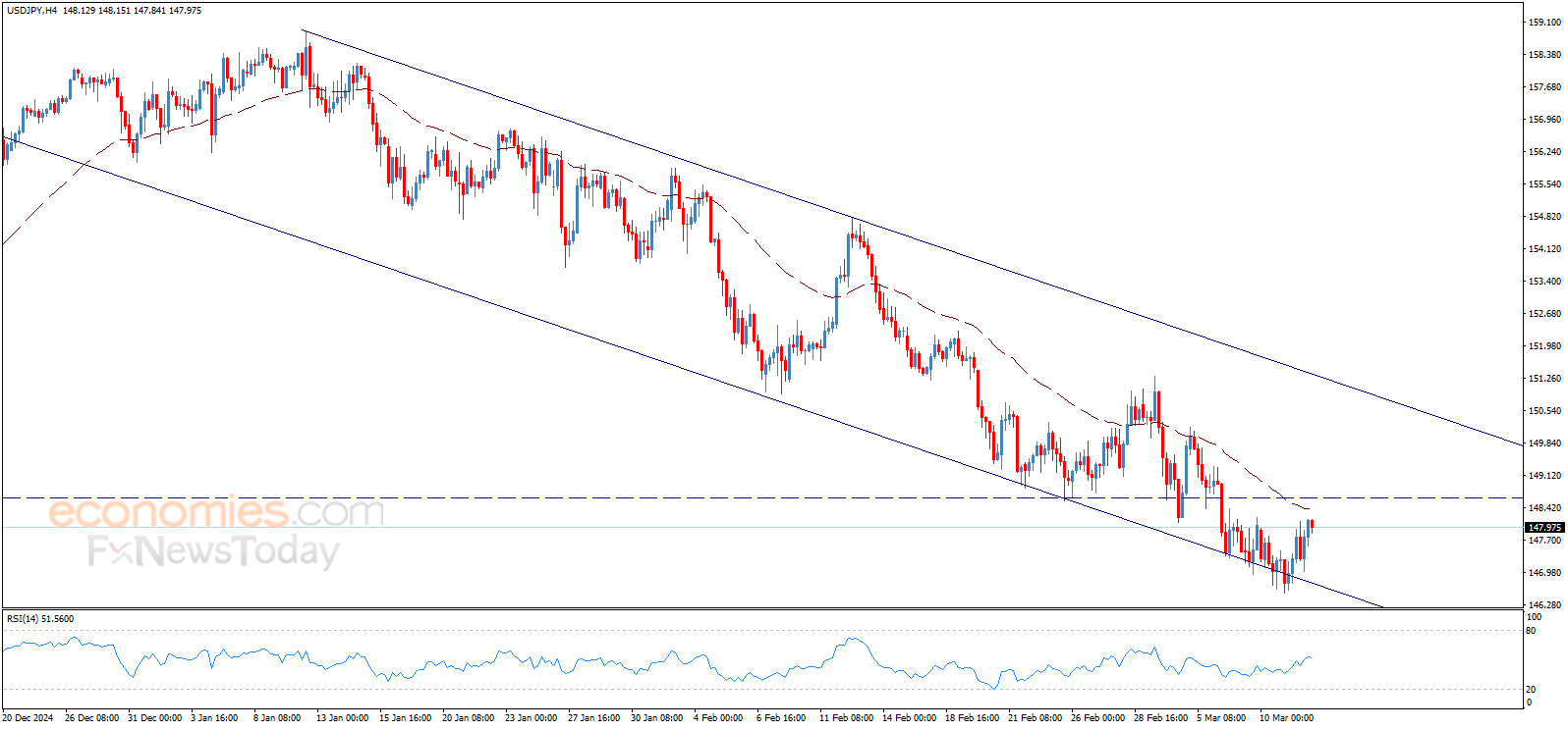 The USDJPY price traded with clear positivity yesterday to breach 147.65 and settle above it, starting today with additional bullish bias to head towards potential test to the key resistance 148.65, noting that the EMA50 forms continuous negative pressure against the price, to support the chances of continuing the overall bearish trend.