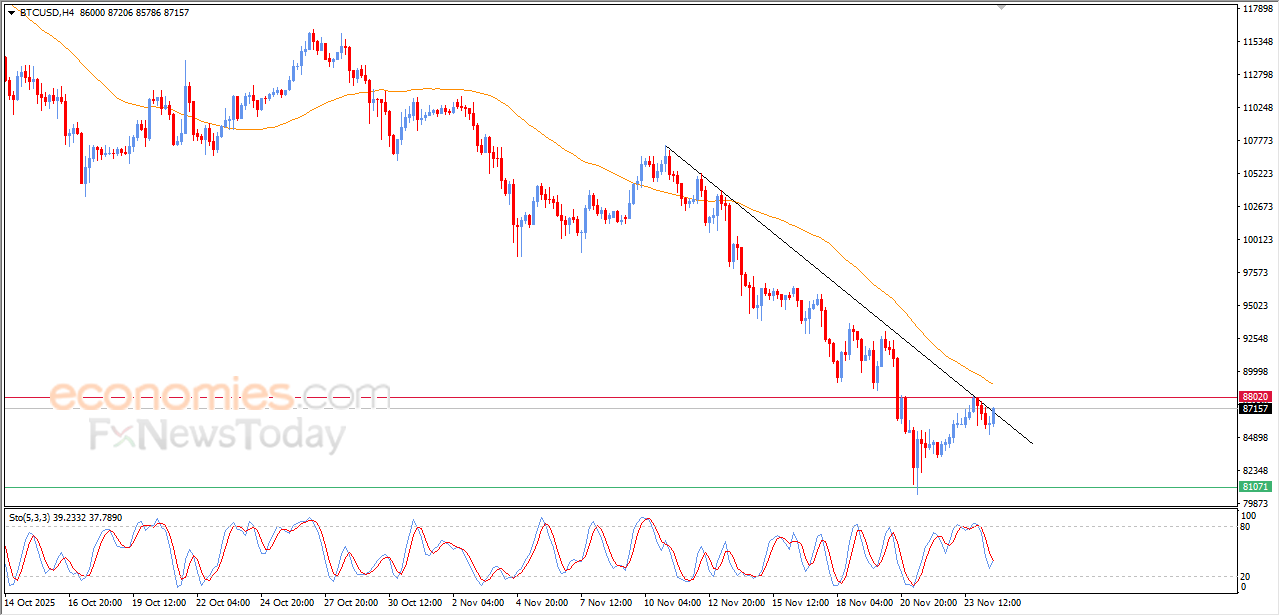 The (BTCUSD) price rose in its recent intraday trading, with the emergence of positive overlapping signals on the relative strength indicators, if it manages to offload its overbought conditions, attacking minor bearish trend line on a short-term basis, amid the continuation of the negative pressure due to its trading below EMA50, reducing the possibilities of the price recovery on a near-term basis.