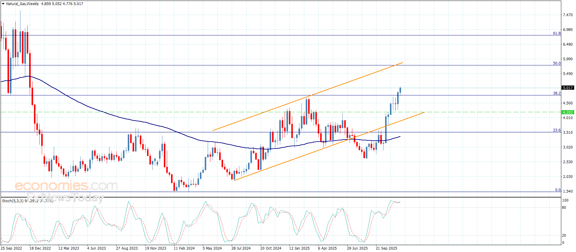 Natural gas price continued forming bullish waves, taking advantage of its stability within the bullish channel’s levels, to form a solid support by %38.2 Fibonacci correction level at $4.500, to approach from the initial main target by reaching $5.052 level.
