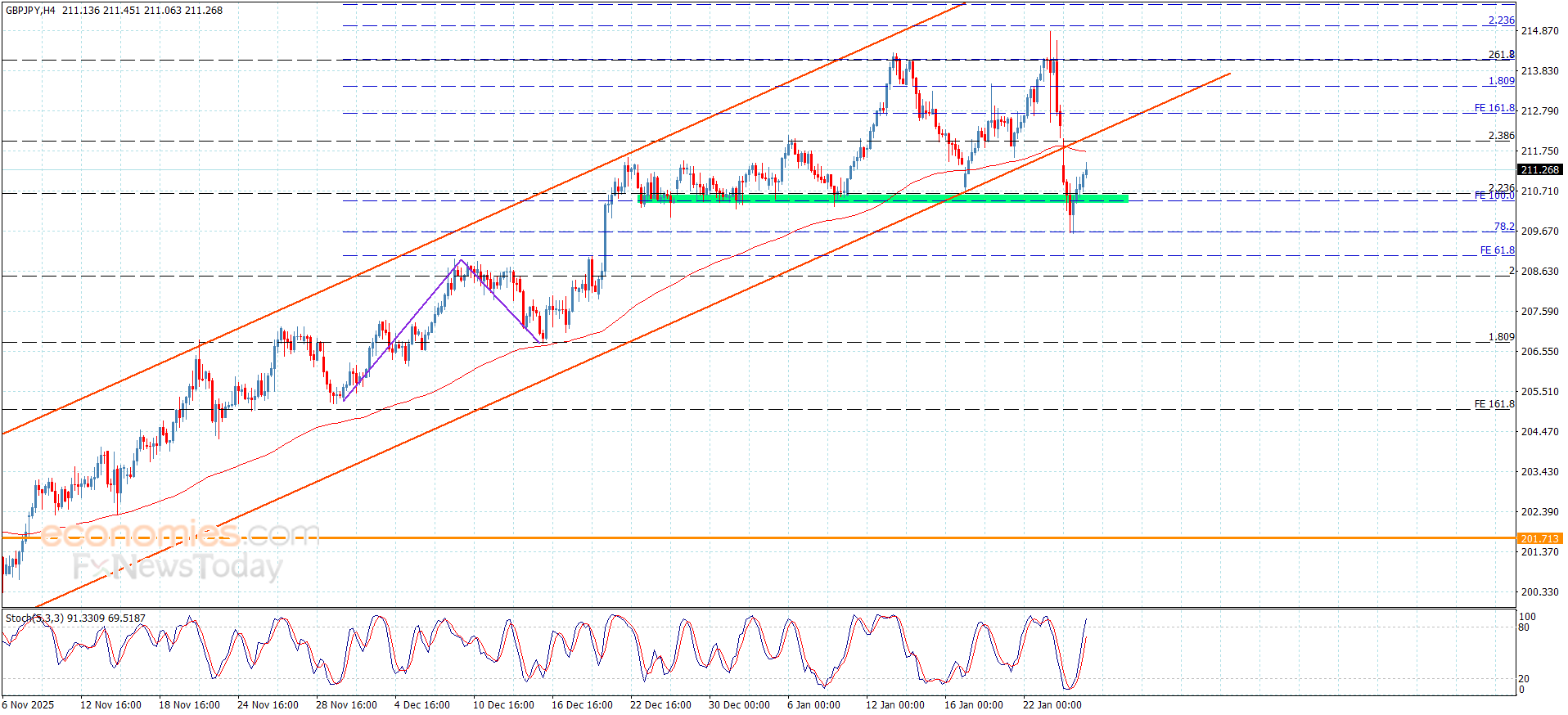 The GBPJPY pair ended the last corrective decline by facing the support at 209.65, forming the main target in the previous report, to begin activating the bullish waves, to surpass 210.65 barrier, to recover some losses by its rally towards 211.35.