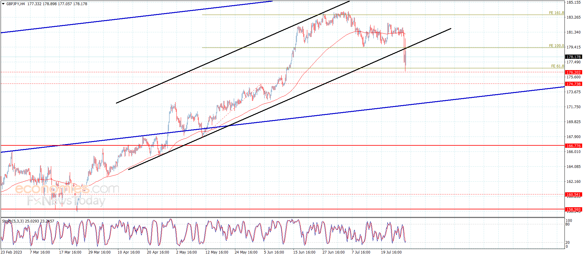 The GBPJPY pair faced strong negative pressures to force it to decline below the minor bullish channel’s support line at 179.35, to notice suffering big losses by touching 176.30 followed by starting to cover some losses by moving towards 178.45.