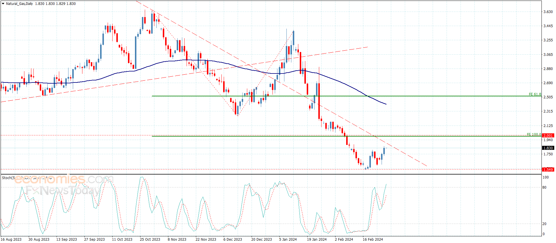 Natural gas price continued to form positive crawl recently, reaching 1.854 level, hinting its preparation to build new bullish track in the near term and medium term period, reminding you that the bullish track depends on the stability of 1.560 support line, while stochastic continuous positive momentum signals will increase the chances of surpassing 2.000 resistance to move to new positive stations and wait to target 2.200 followed by 2.420 in the medium term period.