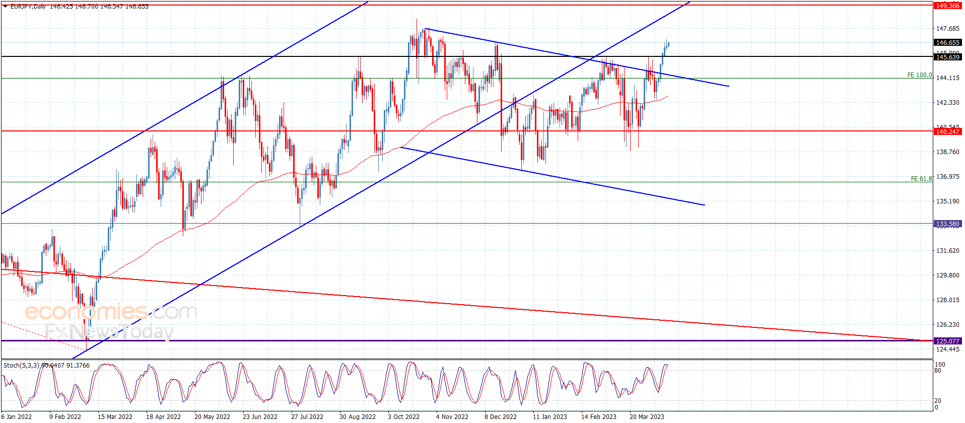 The EURJPY pair kept its positive stability above the support level at 145.65, to notice its fluctuation near 146.70, to confirm the continuation of the suggested bullish bias domination.