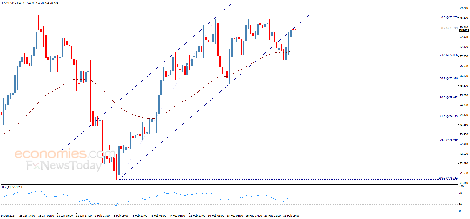 Crude oil price shows more bullish bias and attempts to return to the bullish channel, to reinforce the chances of continuing the bullish trend and achieve more gains in the upcoming sessions, waiting to test 78.75 initially, noting that breaching it will push the price towards 80.00 as a next main station.