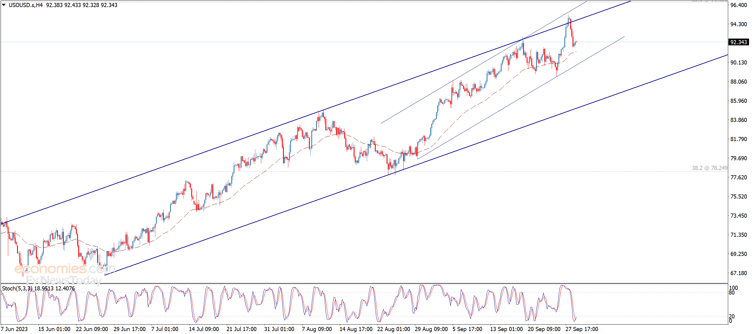 Crude oil price bounced downwards strongly after reaching 95.50 areas, to head towards potential visit to the minor bullish channel’s support line around 89.90, noting that breaking this level will push the price to achieve more bearish correction on the intraday and short-term basis.
