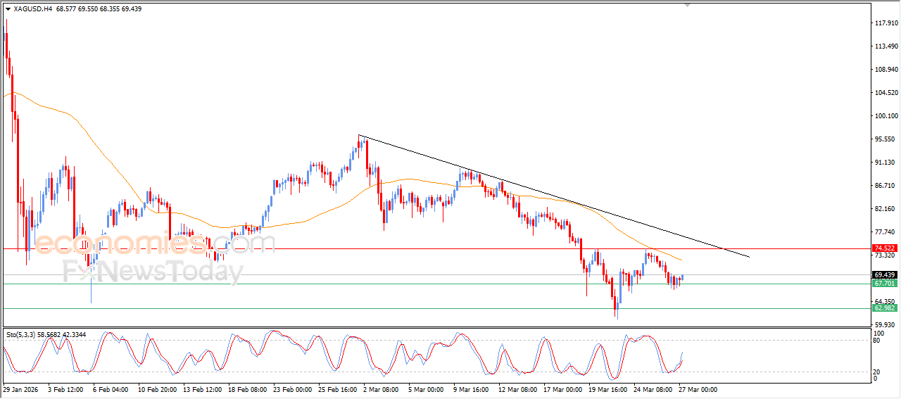 Silver price posted slight gains during recent intraday trading, supported by holding above the current support level at $67.70. This provided temporary positive momentum, helping the price reduce part of its losses. The move also coincided with attempts to ease oversold conditions on the relative strength indicators, supported by emerging positive signals.