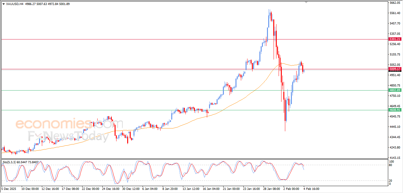 Gold price declined in its last intraday trading, to settle below $5,000 resistance, as it reached EMA50’s resistance, which forced it to rebound lower especially with the emergence of the negative signals from relative strength indicators, after reaching overbought levels, besides the dominance of bearish corrective wave on short-term basis.