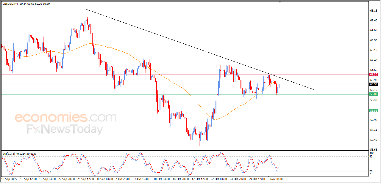 The (crude oil) rose in its last trading on the intraday basis, due to the stability of the key support at $59.80, gaining bullish momentum to offload some of its clear oversold on the relative strength indicators, especially with the emergence of the positive signals from there, reaching the resistance of its EMA50, amid the dominance of the bearish trend on the short-term basis and its trading alongside trend line.