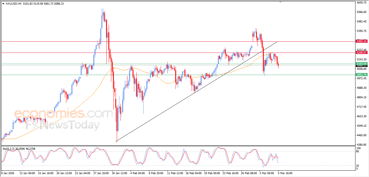 Gold’s price declined in its last intraday trading, to reach our morning expected target at $5,100 support, amid the continuation of the negative pressure due to its trading below EMA5, with the emergence of negative signals from relative strength indicators after offloading its overbought condition, intensifying the negative pressure on the price.