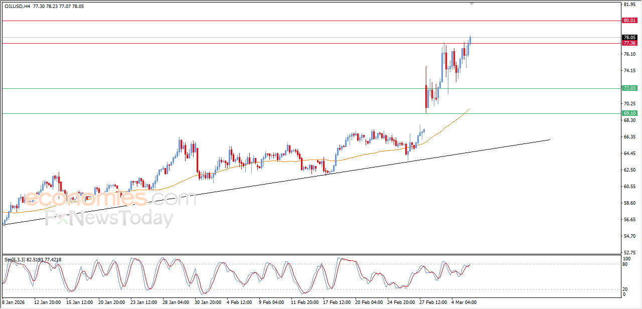 The (crude oil) price extended its gains in its last intraday trading, breaching $77.35 resistance, opening the way for targeting new resistance levels, amid the dominance of the main bullish trend on short-term basis, with the emergence of the positive signals from relative strength indicators, despite reaching overbought levels.