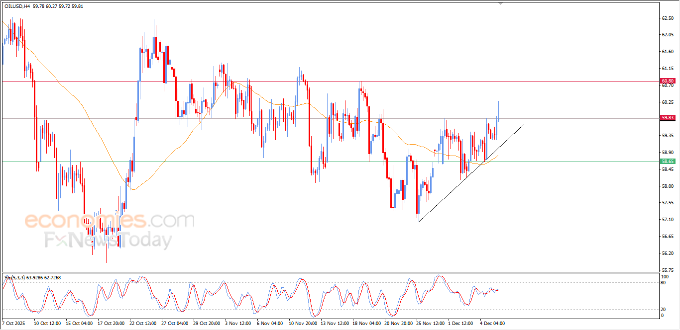 The (crude oil) reduced its recent gains, amid its attempts to breach the solid resistance at $59.80, supported by its continuous trading above its EMA50, with its trading alongside minor bullish trendline on the short-term basis, besides the emergence of positive overlapping signals on the relative strength indicators.